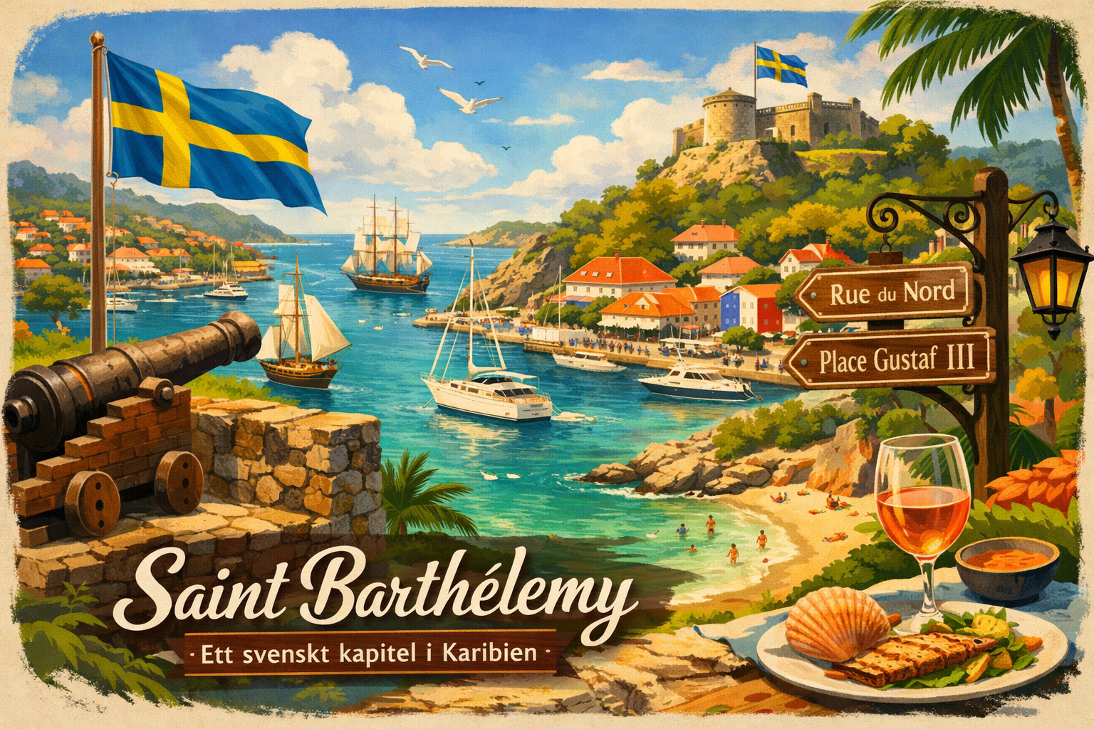 Mellan 1784 och 1878 var Saint Barthélemy faktiskt svensk. En ganska osannolik tanke, där palmer, handelsskepp och tropisk hetta mötte kungliga beslut från Stockholm. Ön fick sin huvudstad döpt till Gustavia, efter Gustav III, och utvecklades snabbt till en frihamn och handelsplats. Här passerade varor, människor och idéer – långt från det Sverige vi oftast förknippar med samma tidsepok.